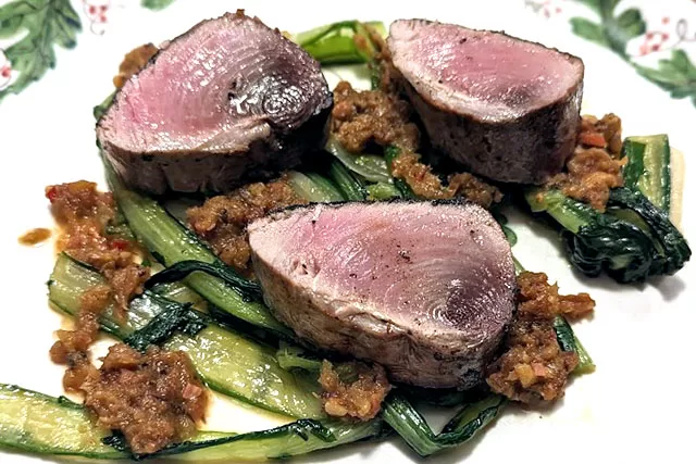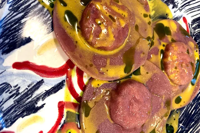 Carpaccio van geroosterde biet met geitenkaas, walnoten en balsamico