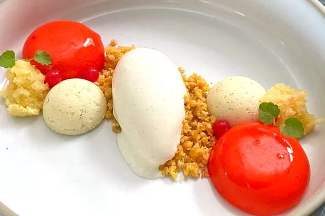 Een romige mousse van mascarpone en vanille, geserveerd met een frisse coulis van rood fruit en een knapperige crumble van geroosterde amandelen
